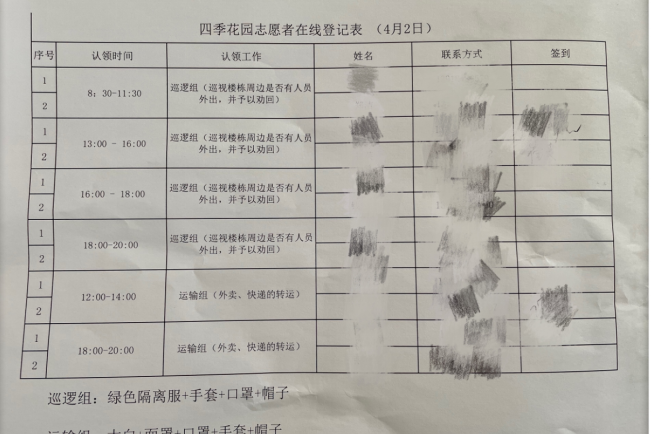 上海龙柏四季花园小区抗疫志愿者群里人数高达50多人,占小区总户数的10%,物业与志愿者前一天晚上在群里根据志愿者的报名情况,共同制定《志愿者工作分工表》,分巡逻组与运输组,分别负责小区楼栋周边的巡视和外卖快递的运转,保证第二天小区的良好运转。