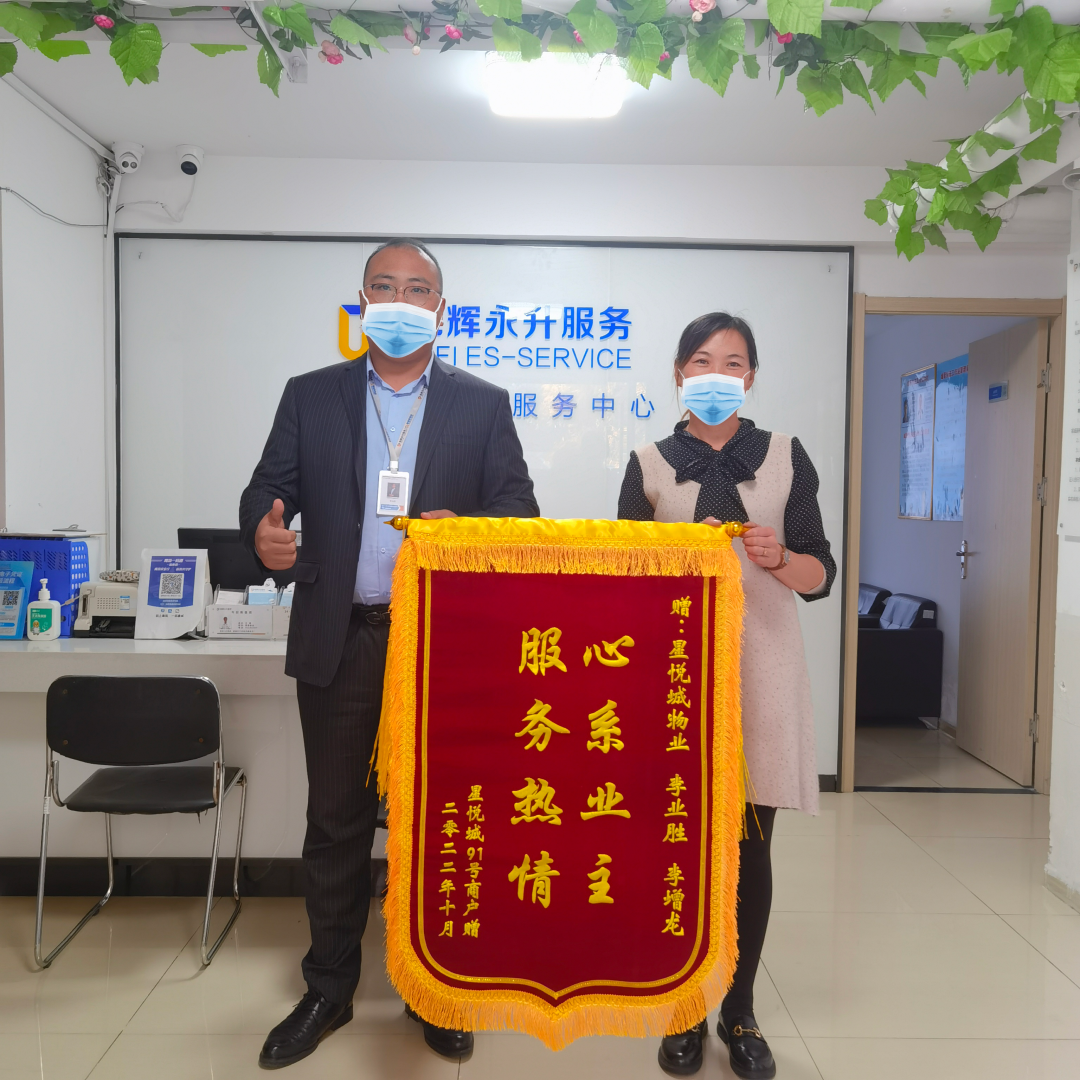 2022年10月12日下午,青岛星悦城一业主拿着一面锦旗送到服务中心前台,激动地说要亲手送到项目经理李业胜的手中。