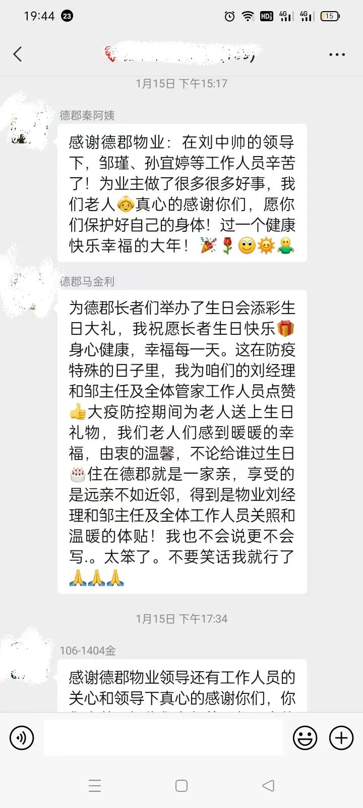 为了方便老业主,“德郡长者生日会”也改成了管家上门慰问,过生日的德郡长者,开门看到康乃馨花束和鸡蛋、牛奶、生日卡的那一刻,露出了幸福的笑容,有位大叔含着泪问物业管家“我的孩子都不记得我过生日,你们是怎么知道的?”物业管家笑着说:“因为咱们德郡物业有养老啊!”