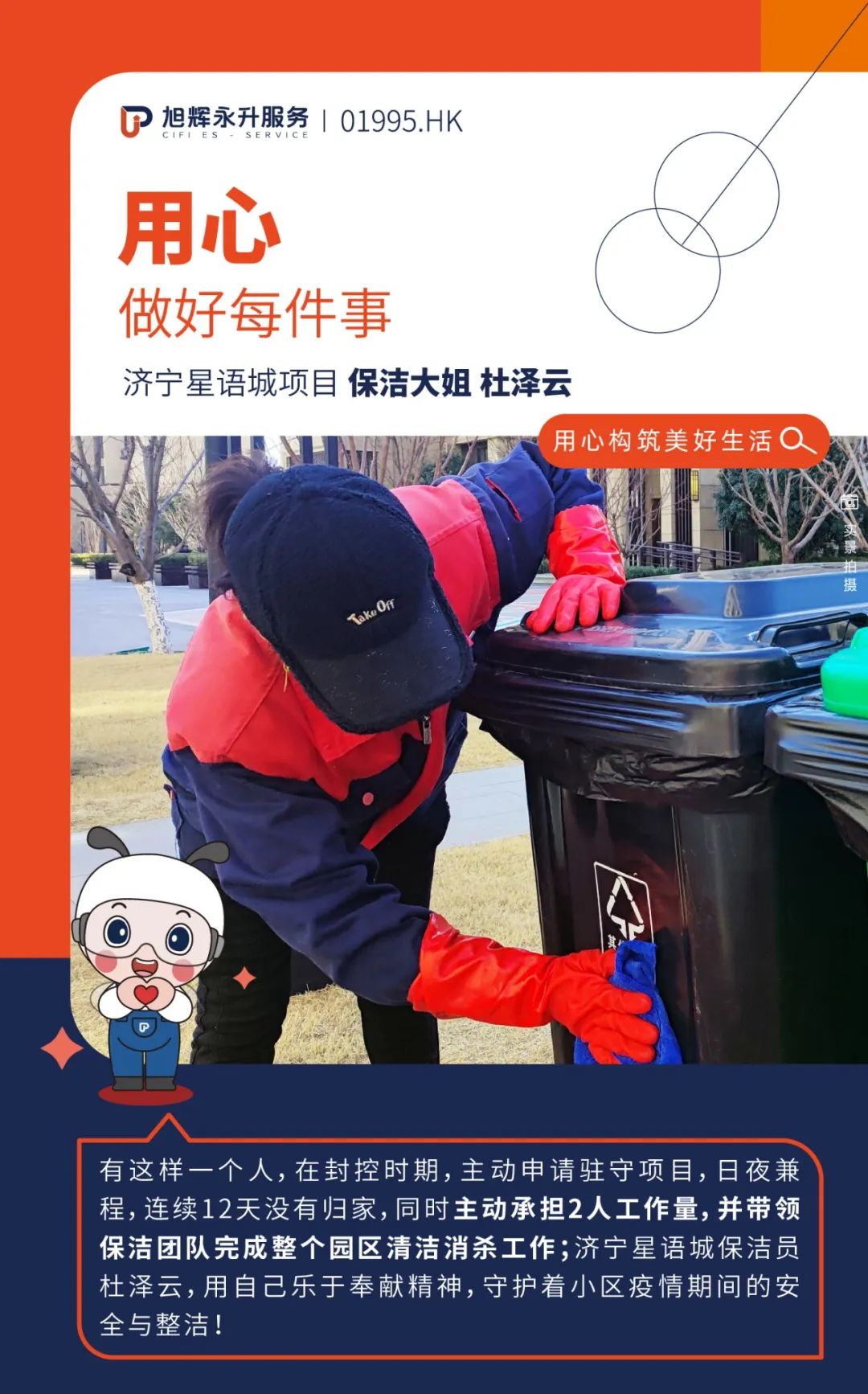 在永升社区,有许多普通的保洁人员,花费数以千计的时间,将清洁这一件事做到极致。保洁的日常,是将干净整洁的园区呈现在业主眼前,这其中包含了,楼道、大厅、园区等区域的多处细节。他们在日积月累的付出中,为业主提供舒适的生活环境,每一处漫不经心走过的地方,都是他们的用心。