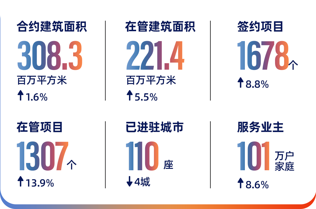 业绩公告显示,公司期内营收较去年同期增长4.2%至人民币65.4亿元,归母净利润保持稳定为4.3亿元,在宏观经济和行业发展环境承压的背景下实现了经营性现金流大幅增长至9.1亿元,平稳度过行业低谷期;签约服务面积增长1.6%至3.1亿平方米,在管服务面积增长5.5%至2.2亿平方米。整体态势稳健,经营指针回归,呈现进阶启航之势。