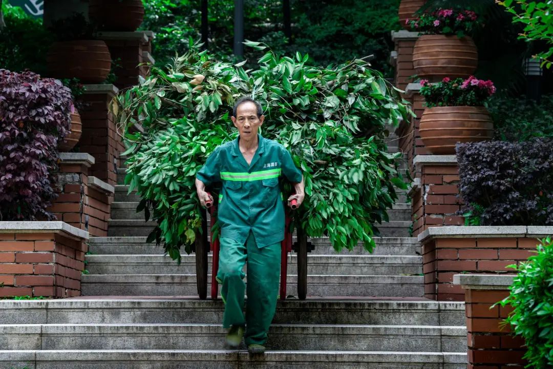 “美好由汗水灌溉,长情让长青成为常态。重庆朗香郡的绿化员熊维平虽然身材清瘦,但拉着60多斤的树枝连续行走108级台阶,他却走得极稳。”