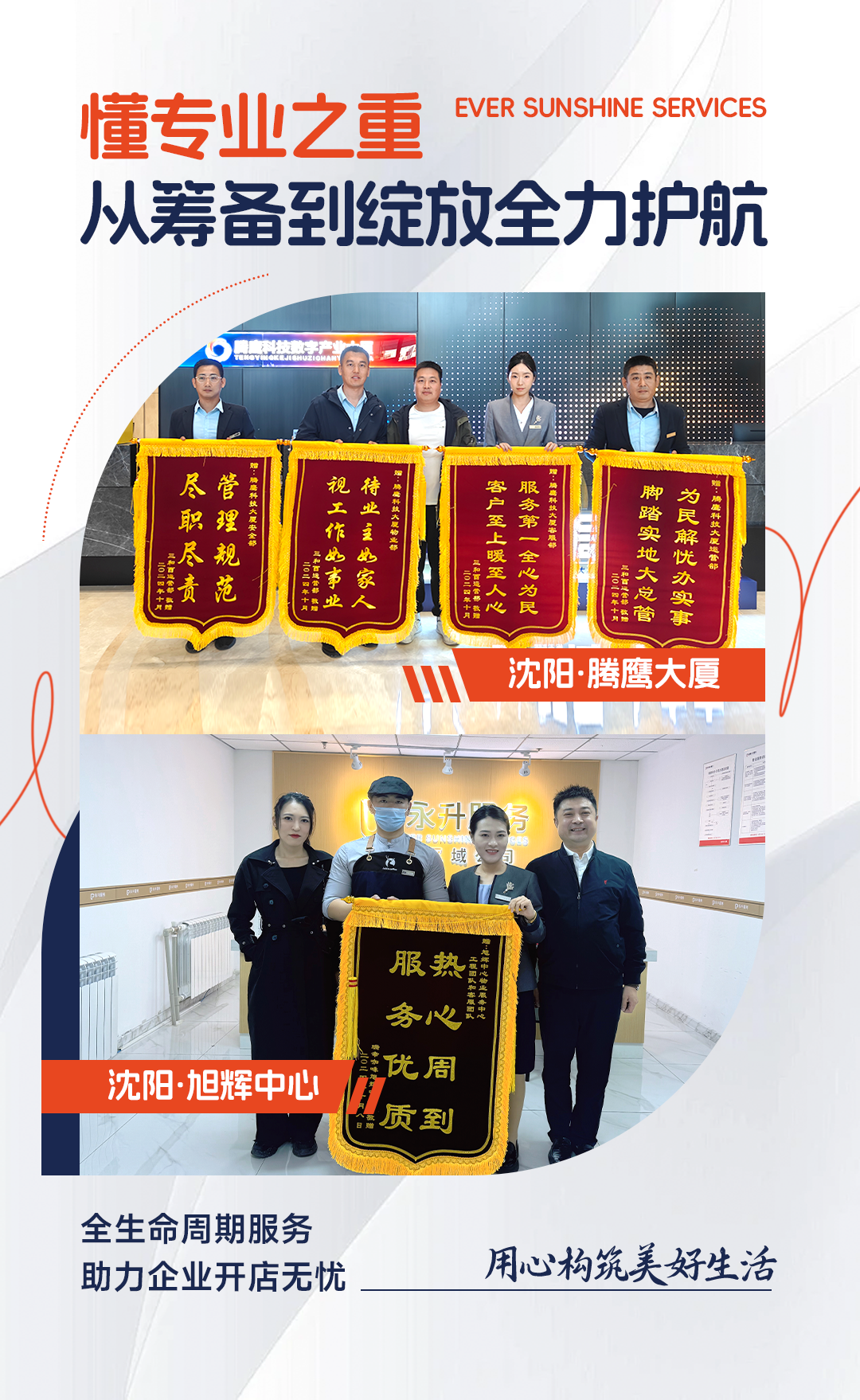 “从前期进场到顺利开业,三和酉走的每一步,真的都离不开永升服务的支持与帮助”三和酉负责人特意定制锦旗,对永升服务给予高度评价。像这样的案例还有很多,沈阳旭辉中心项目团队,协助瑞幸咖啡装修团队解决遇到的问题,帮助客户缩短工期,使瑞幸咖啡提前完成装修顺利开业,同样获赠客户的“满意”锦旗。