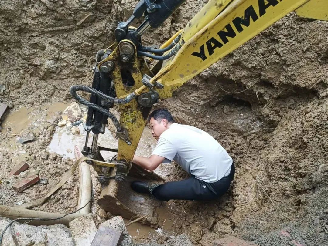 无独有偶,2023年6月,黄岛另一个住宅小区:星河城19号楼东侧车位突发冒水,根据图纸与现场排查,老翟判断是因用水高峰时段,高区自来水管爆管,便联系机械现场开挖维修。挖到1米半左右,因为地下出现大量管线,情况复杂,无法继续用机械解决,他带头人工开挖......不一会儿,老翟的手臂已是青一块紫一块了。在挖到2.3米左右时终于将管道挖出,发现直径160mm的管道与直径75mm的管道同时开裂。找到了症结所在,老翟抓紧用电接焊熔接机进行熔接,终于在夜间8点左右、业主休息之前恢复管道供水。