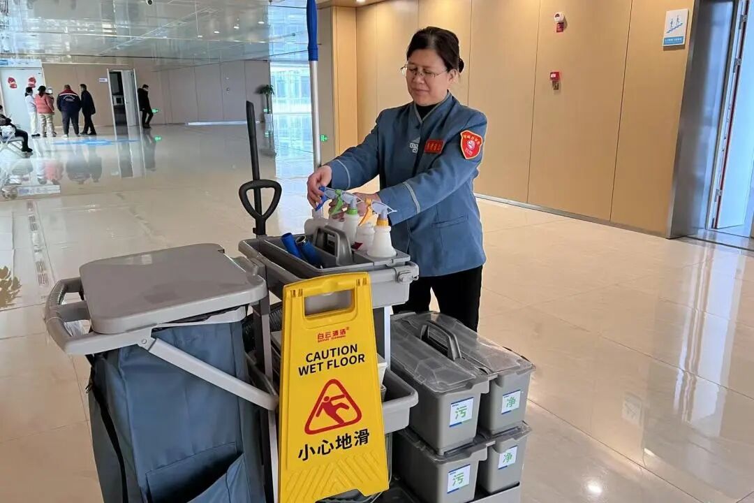 走进邹平市人民医院,保洁员手中的标准化工具车犹如一套移动的操作系统。保洁工具车严格分区:上层清洁药剂与分色毛巾,中层水桶,前部实现地巾“净污分离”,后部与侧方分别收纳垃圾袋、警示牌与防风扫套。每件工具定位明确,从物理源头杜绝交叉污染。